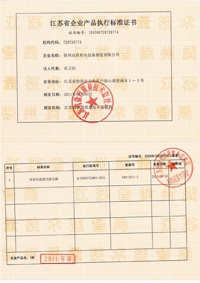 2011年3月28日,由徐州眾凱公司負(fù)責(zé)起草的《雙向?qū)α鳚袷匠龎m器》企業(yè)標(biāo)準(zhǔn),通過(guò)徐州市質(zhì)量技術(shù)監(jiān)督局備案注冊(cè),并于當(dāng)日首次發(fā)布,2011年3月30日正式實(shí)施。