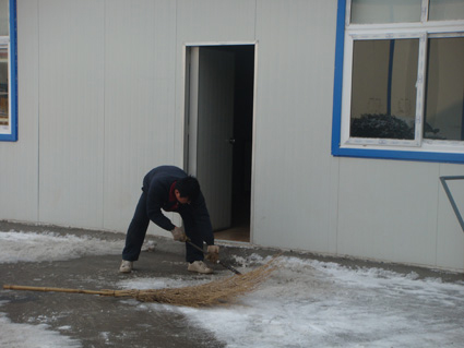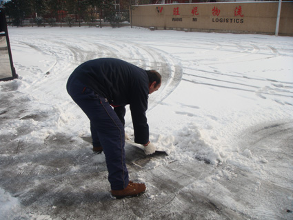 2月11日,徐州普降今冬第一場(chǎng)大雪。今天是上班最后一天,盡管道路很滑,大家依然按時(shí)到達(dá)公司。個(gè)別同事甚至一路步行過(guò)來(lái)上班。到公司后,發(fā)現(xiàn)早到的同事已經(jīng)開(kāi)始自覺(jué)的清掃積雪。由于昨晚下了大量?jī)鲇,地面早已結(jié)冰,積雪掃干凈后,地面依然很滑。大家八仙過(guò)海各顯神通,有的拿掃帚、有的用鐵鍬、有的用鐵棍、鐵板等各種工具來(lái)鏟除滑冰,清理路面,以確保大家的出行安全及生產(chǎn)活動(dòng)的正常開(kāi)展。