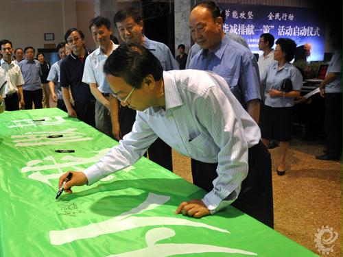 李毅中在“我為節(jié)能減排獻(xiàn)一策”淺綠色橫幅上簽名。