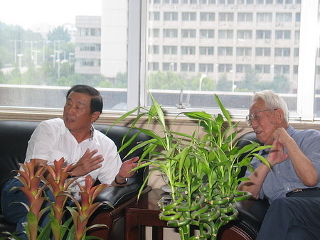參觀完院區(qū),周昌貢總經(jīng)理一行看望了朱尊權(quán)院士和袁行思老院長。一見到來自湖南的客人,朱老就關(guān)切地詢問湖南煙葉的種植情況并向他們表達(dá)了要在煙田建車間的愿望。周昌貢總經(jīng)理很欽佩朱老能在耄耋之年依然關(guān)心煙草農(nóng)業(yè)生產(chǎn),并表示如果朱老的建議能被采納,愿意將湖南中煙下屬的某個煙葉生產(chǎn)基地作為朱老這一創(chuàng)新想法的第一塊試驗田。