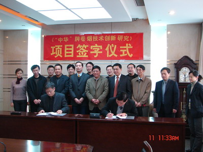 在協(xié)議書簽訂后第五天,上海煙草(集團)公司高憲法巡視員、施超副總經(jīng)理等一行五人來到鄭州院,簽訂了《“中華”牌卷煙技術創(chuàng)新研究(07年度)》技術開發(fā)合同。此合同的簽訂標志著鄭州院與上海集團圍繞“中華”牌卷煙技術創(chuàng)新研究工作的正式啟動。