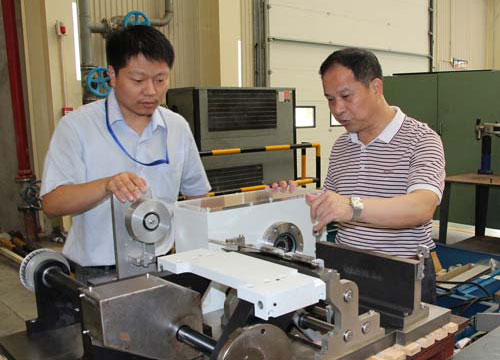 杜國鋒(右)與技術人員研討YB49超高速包裝機往復模合實驗裝置裝配。毛炯杰攝