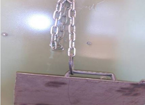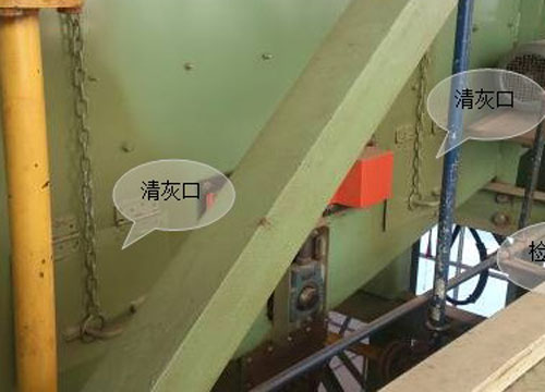 為此,生產(chǎn)加工車間通過開展QC小組活動,對預(yù)壓機(jī)雙向喂料皮帶維護(hù)保養(yǎng)難的問題進(jìn)行攻關(guān),對設(shè)備進(jìn)行小的改造,在雙向輸送帶側(cè)板兩邊各自開了兩個清灰口,在清灰口上安裝了一道可以打開關(guān)閉的門,在門上安裝防止脫落的鐵鏈,鐵鏈上有一個掛鉤便于清灰時將門固定在鐵鏈上,這樣清理人員可以安全的站在檢修平臺上進(jìn)行徹底的清里。見圖二。