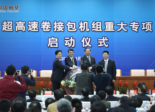 在本次會(huì)議上,還舉行了超高速卷接包機(jī)組預(yù)訂單簽字儀式和超高速卷接包機(jī)組重大專項(xiàng)啟動(dòng)儀式。中國(guó)煙草機(jī)械集團(tuán)分別與上海煙草集團(tuán)有限責(zé)任公司、云南中煙工業(yè)有限責(zé)任公司等十家國(guó)產(chǎn)超高速卷接包機(jī)組的用戶單位簽署了超高速卷接包機(jī)組預(yù)訂單。國(guó)家煙草專賣局科技司司長(zhǎng)金忠理宣讀了《國(guó)家煙草專賣局關(guān)于啟動(dòng)超高速卷接包機(jī)組研制重大專項(xiàng)的通知》,正式啟動(dòng)實(shí)施超高速卷接包機(jī)組重大專項(xiàng)。