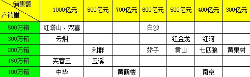 ——湖南中煙:“白沙”確立500萬(wàn)箱,“芙蓉王”力突1000億元,即:到2012年,“白沙”品牌規(guī)模300萬(wàn)箱,“芙蓉王”品牌規(guī)模100萬(wàn)箱,兩大品牌實(shí)現(xiàn)稅利500億元,在此基礎(chǔ)上,再過(guò)5年或者更長(zhǎng)一點(diǎn)時(shí)間,“白沙”品牌規(guī)模500萬(wàn)箱,“芙蓉王”品牌規(guī)模150萬(wàn)箱,兩大品牌實(shí)現(xiàn)稅利1000億元。