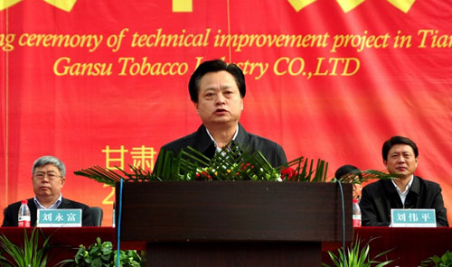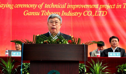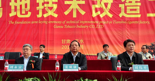 劉永富在奠基儀式上致辭,他說(shuō),國(guó)家煙草專賣局決定實(shí)施天水卷煙廠易地技術(shù)改造項(xiàng)目工程,為甘肅煙草工業(yè)加快發(fā)展注入了強(qiáng)大動(dòng)力。甘肅煙草工業(yè)有限責(zé)任公司要全面貫徹實(shí)施卷煙上水平戰(zhàn)略,落實(shí)樹品牌、做貢獻(xiàn)要求,加快工程建設(shè)進(jìn)度,加速技術(shù)創(chuàng)新能力,加強(qiáng)卷煙品牌建設(shè),科學(xué)管理,保證質(zhì)量,努力把天水卷煙廠建設(shè)成為技術(shù)、管理、產(chǎn)品、效益一流的優(yōu)秀企業(yè),促進(jìn)甘肅煙草工業(yè)在更高層次、更高水平取得更好更快的發(fā)展。天水市委、市政府和省直各有關(guān)部門,要全力關(guān)心支持這個(gè)項(xiàng)目,及時(shí)解決項(xiàng)目建設(shè)中存在的困難和問題,確保項(xiàng)目早日建成投產(chǎn)!